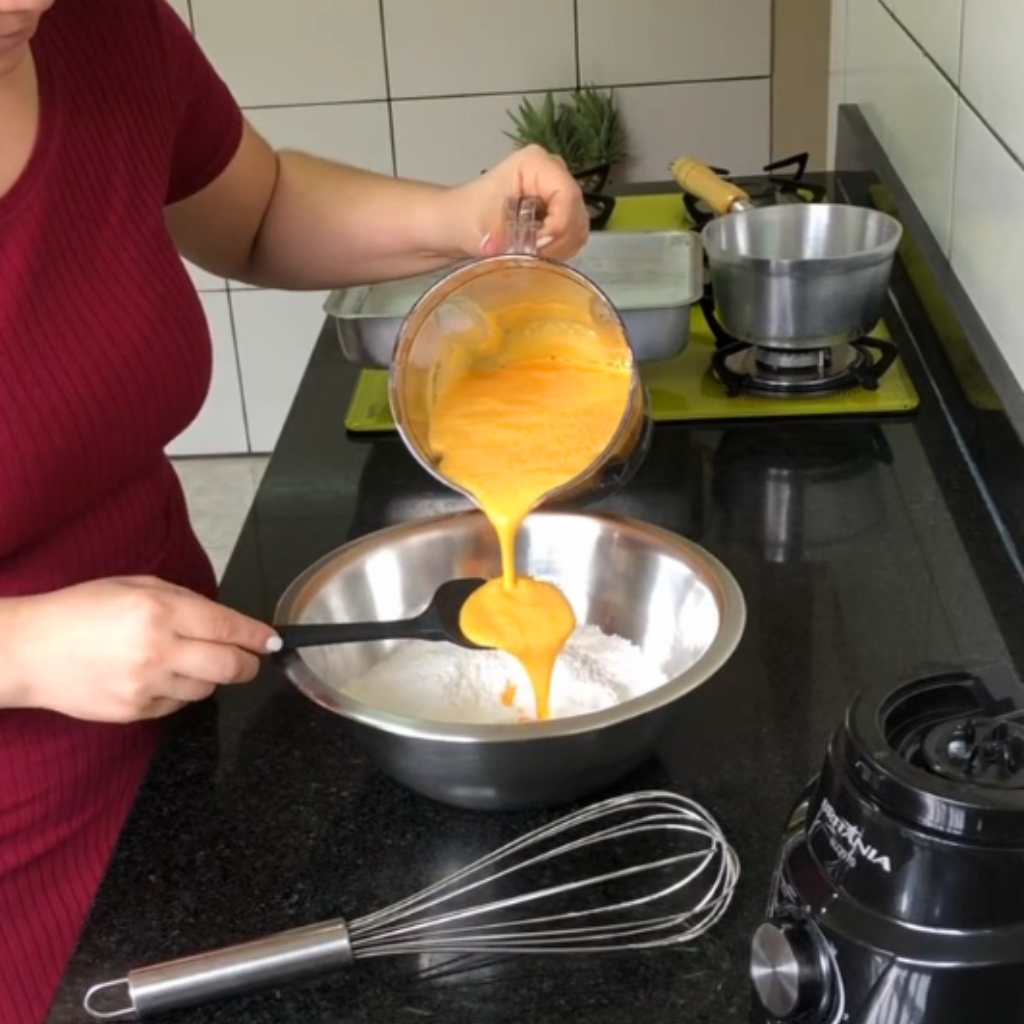 2. No liquidificador, bata os ovos, o óleo, o suco de laranja, a cenoura e o açúcar ou adoçante até formar um creme homogêneo.