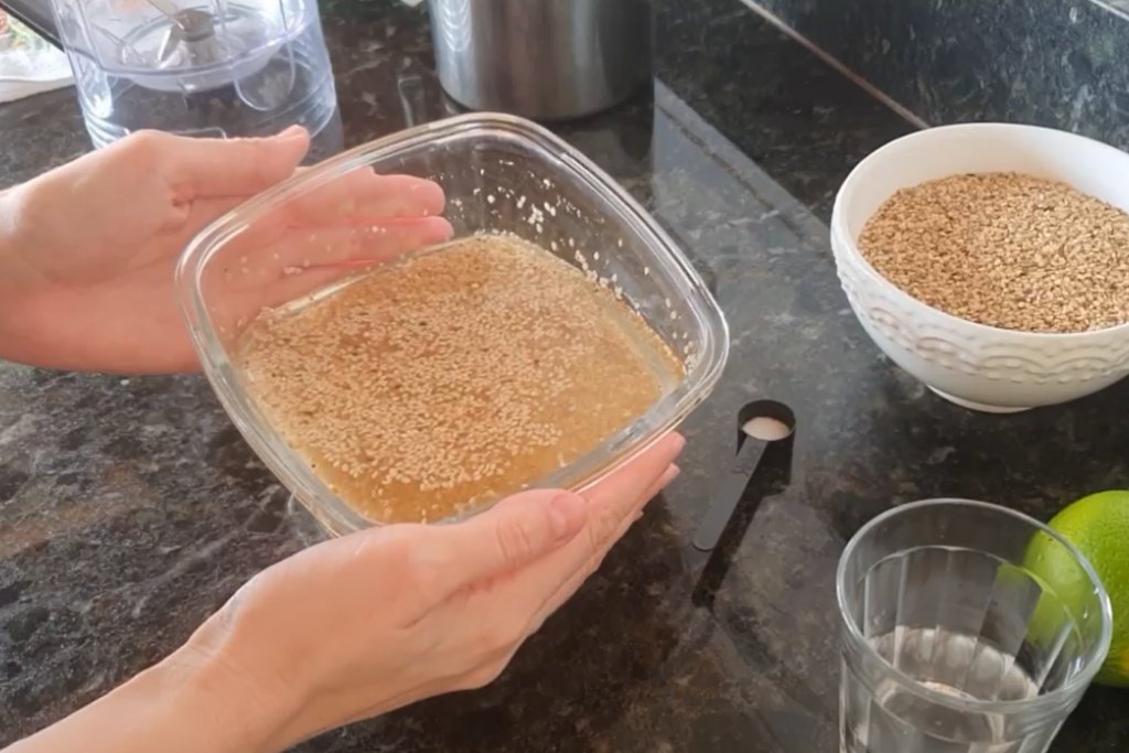 Deixe o gergelim de molho em água filtrada por pelo menos 8 horas ou durante a noite. Isso ajuda na digestão e deixa o creme mais liso. Depois, escorra e enxágue.