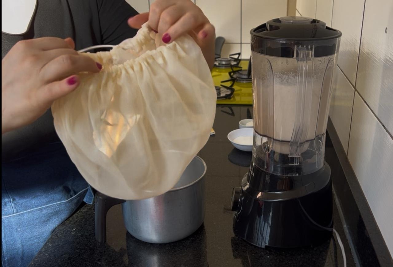 Se desejar leite mais liso, coe usando um pano de algodão ou peneira fina. Para smoothies ou cafés, pode usar sem coar.